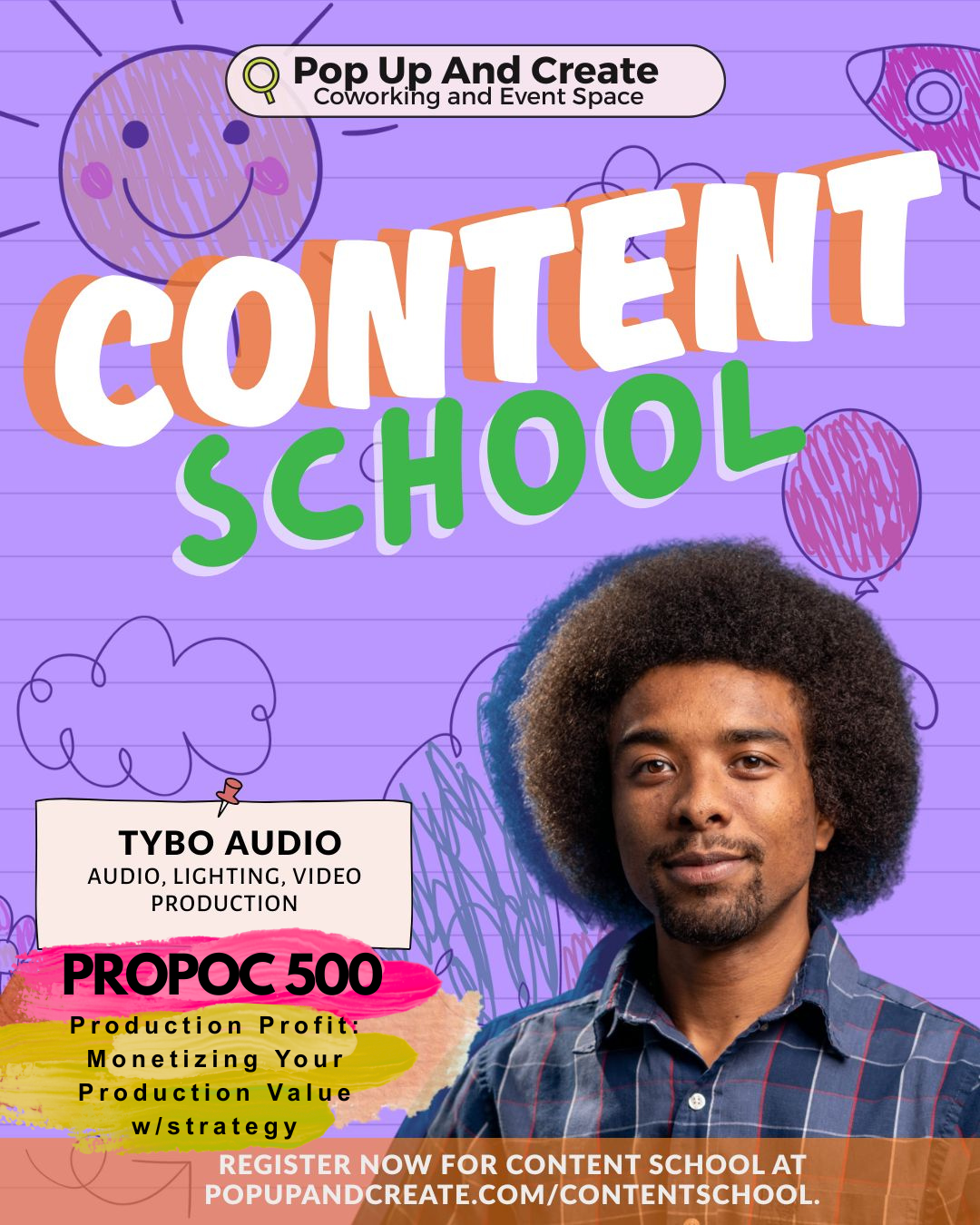 PROPOC500: Producing Profit from Production Skills Learn how to turn your production skills into impact and income. Monetize your talents in audio, lighting, and video production/editing. Learn client work, live events, podcasting, other creative income streams and more!